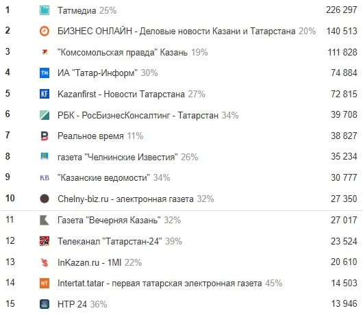 На этот раз в топ-10 есть кое-какие изменения: за семь дней прибавили «Казанские ведомости», начавшие постепенно взбираться наверх; конкретно так нарастил обороты челнинский портал Сhelny-biz, которого неделю назад даже не было в топ-15; а вот «Татарстан-24» серьезно просел и с шестого места за это время откатил сразу на 12-е.