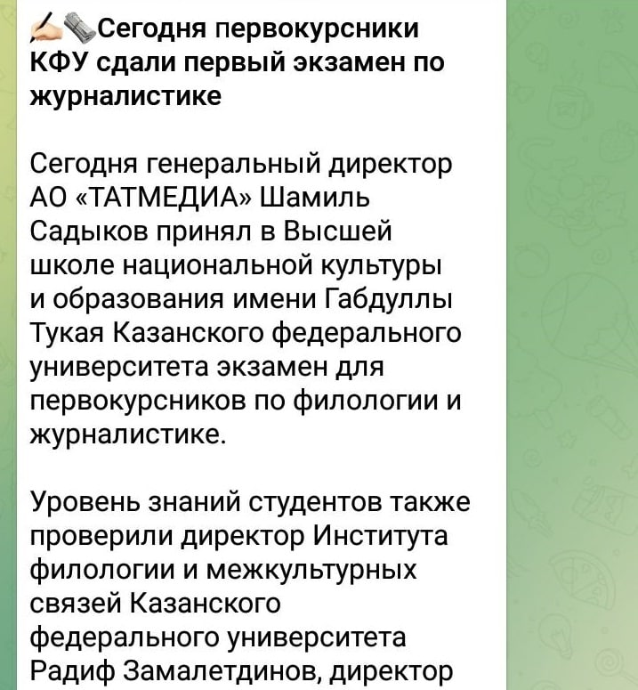 Сегодня же пишут, что гендиректор «Татмедиа» Шамиль Садыков принимал экзамен по журналистике у первокурсников Высшей школы национальной культуры и образования имени Габдуллы Тукая, которая находится в составе этого Института филологии.