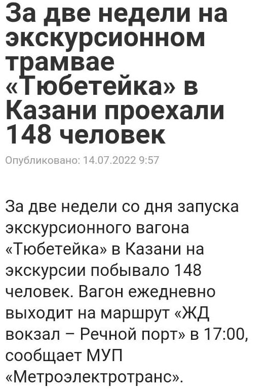 Привет, ттп! Очень смешная получилась информация у пресс-службы Метроэлектротранса. Они похвастали СМИ про экскурсионный трамвай, на котором за две недели проехались аж 148 пассажиров.