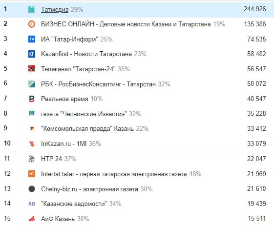 В топ-15 удалось вернуться «Казанским ведомостям», а вот «Вечерняя Казань» осталась прозябать на 17-й позиции. Весь расклад на скрине.