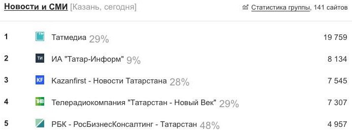 Расстановка сил в рейтинге Liveinternet по местному трафику сейчас сложилась интересным образом: оттуда исчез «Бизнес-онлайн» и первая тройка сейчас за «Татмедиа» (объединенный счетчик всех их ресурсов), «Татар-информом» и Kazanfirst.