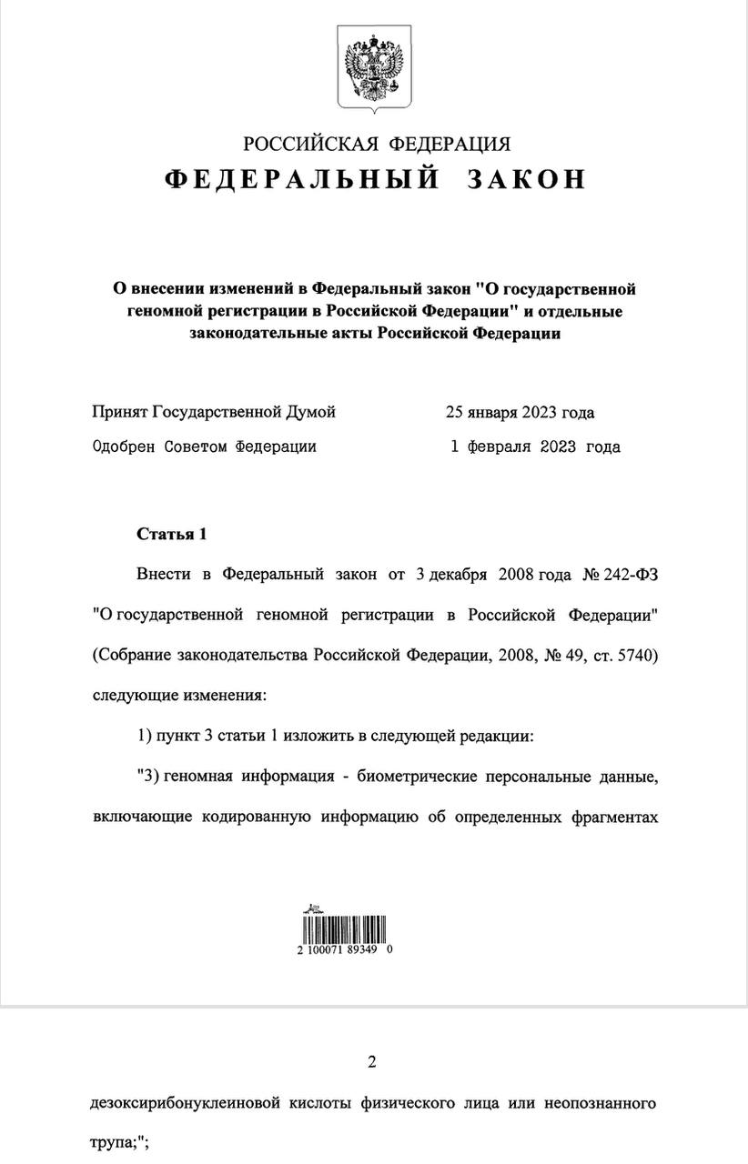 Для общей информации. Официально опубликован Федеральный закон от 06.02.2023 № 8-ФЗ «О внесении изменений в Федеральный закон «О государственной геномной регистрации в Российской Федерации» и отдельные законодательные акты Российской Федерации», который прямо признает геномную информацию биометрическими персональными данными.