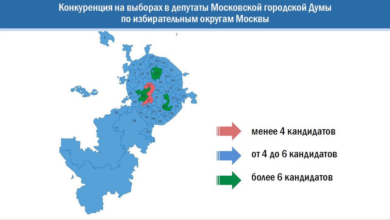 «Выборы в столичный парламент будут конкурентными", - заявил ранее заместитель главы Центризбиркома РФ Николай Булаев. - "В большинстве избирательных округов Москвы в предвыборной гонке принимает участие по 6-7 кандидатов».