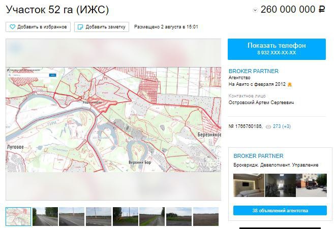 А тем временем бывший главный налоговик обживается в роли предпринимателя и первым делом она выставила на продажу 52 Га земли в двух шагах от базы отдыха «Верхний бор». Бывшие колхозные земли предлагаются под индивидуальную жилищную застройку, хотя, по документам имеют сельхозназначение. При этом, стоимость земли составляет 260 млн рублей или 5 млн рублей за гектар.
