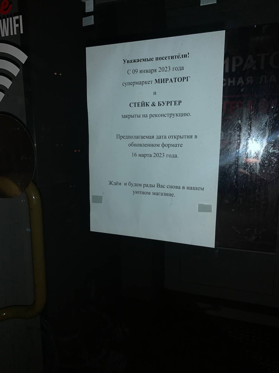 🚫 9 января Бургерная «Стейк&Бургер» и супермаркет «Мираторг» на Ломоносовском проспекте, 29к1 закрылись на реконструкцию ориентировочно до 16 марта.