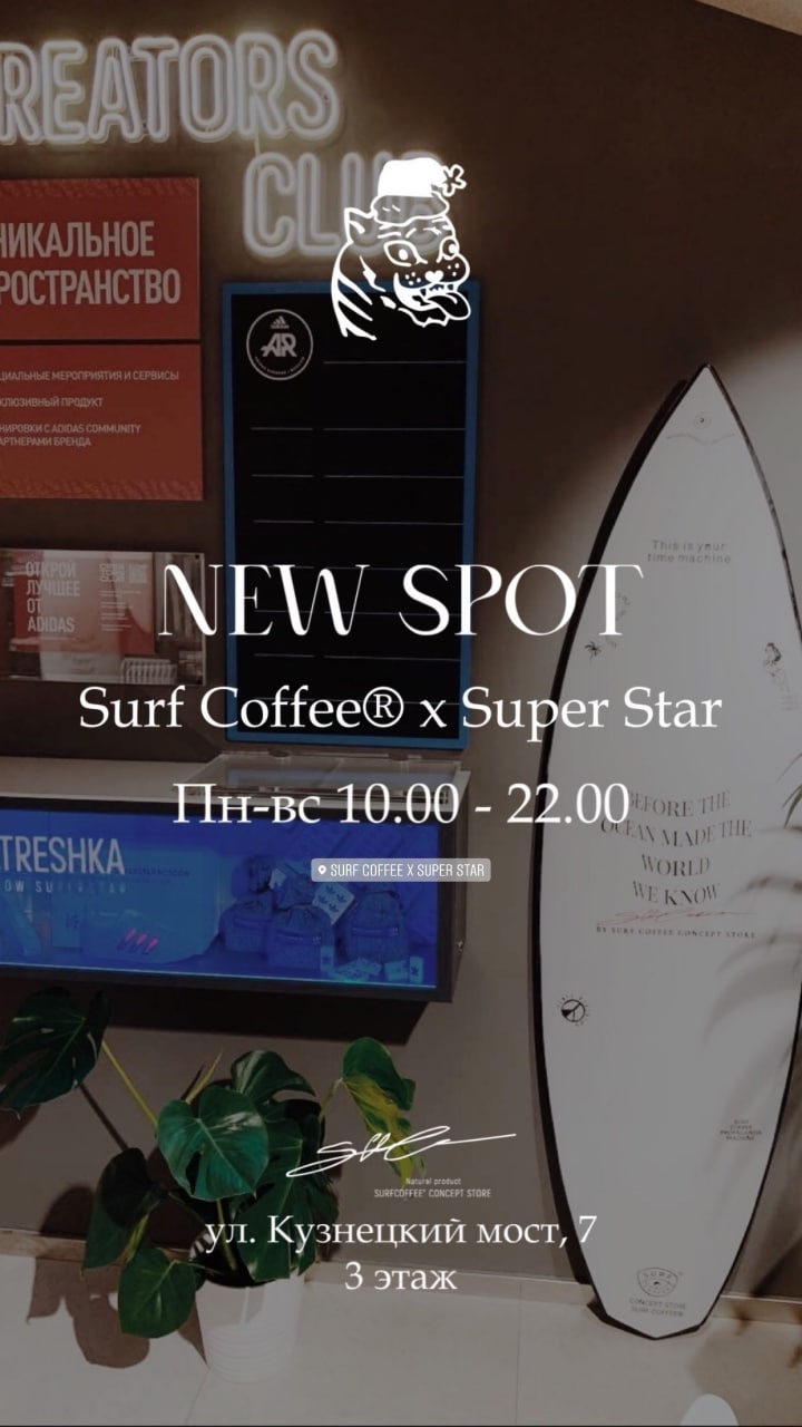 🆕 31 декабря 2020 года на Кузнецком Мосту, 7 навсегда закрылись рестораны Новикова Vogue Cafe, Камчатка и Mr.Lee. Ровно через год, 30 декабря 2021 года на их месте открылся флагманский магазин adidas, занимающий все 4 этажа здания. А вчера на его третьем этаже открылась новая кофейня Surf Coffee x SuperStar.