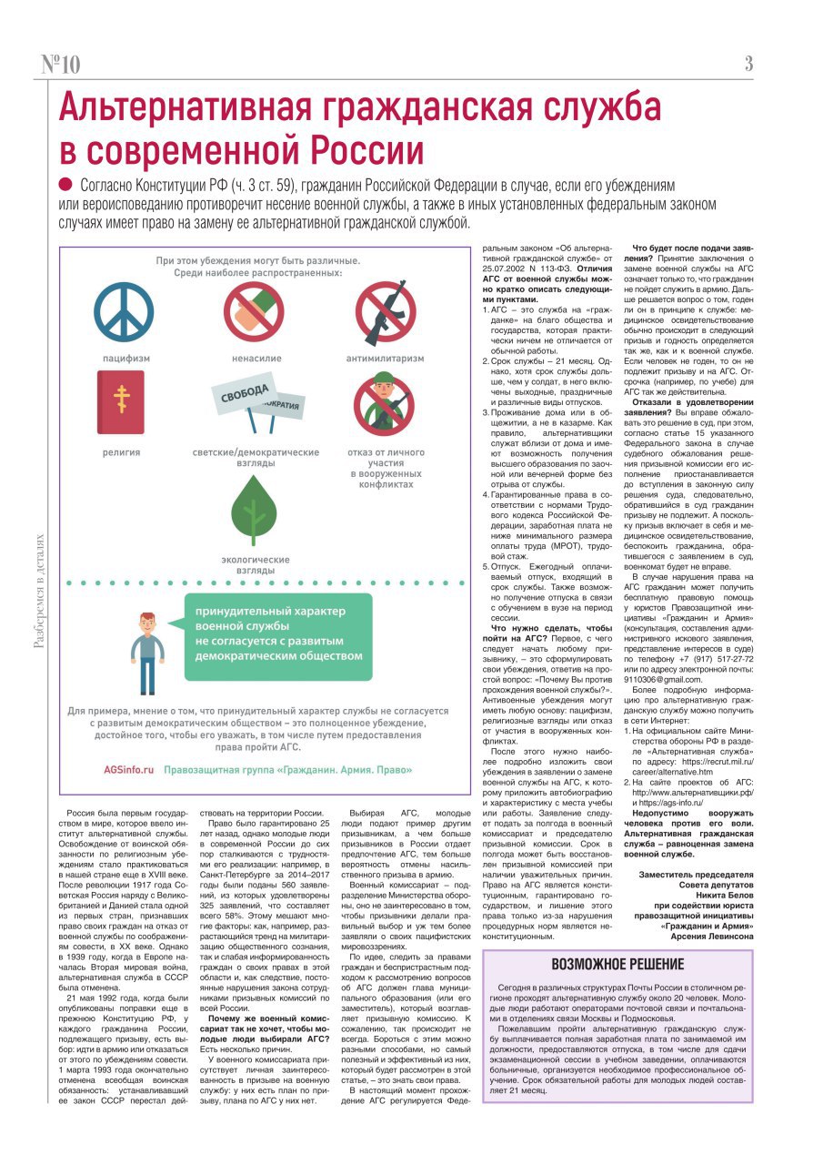 В 1987 Комиссия ООН по правам человека приняла резолюцию, признающую отказ от воинской службы по убеждениям «законным проявлением свободы мысли, совести и религии». В России право на альтернативную гражданскую службу впервые было закреплено в Конституции 1993 года. По закону, не только верующие могут отказаться от службы в вооруженных силах. Другие граждане вправе заявлять не о вере, а об УБЕЖДЕНИЯХ, несовместимых с военной службой: миротворческих, философских, морально-этических, политических и так далее.