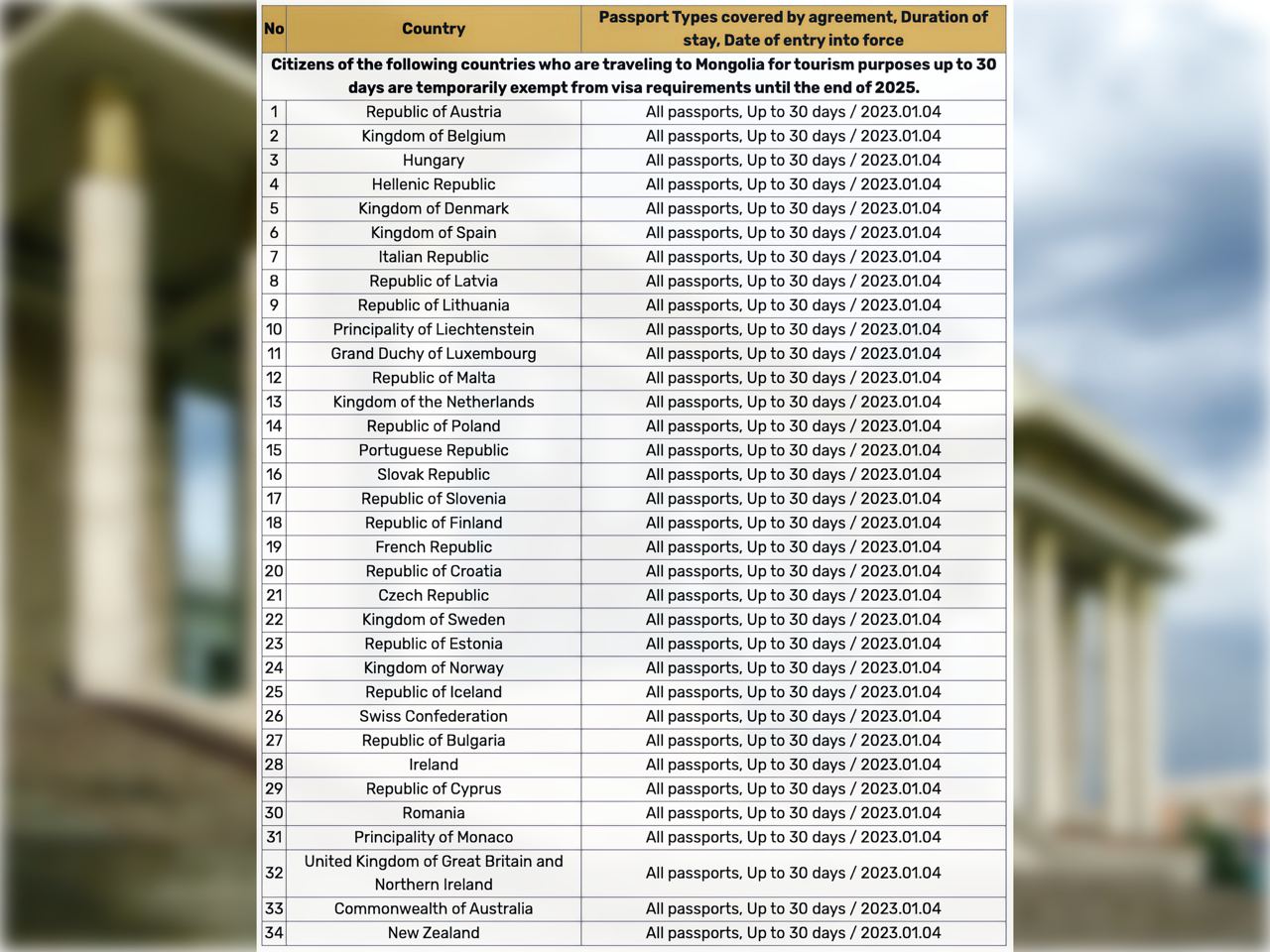 Такое послабление будет действовать с 01 апреля 2023 года по 31 декабря 2025 года для владельцев паспортов государств, перечисленных в прикрепленном к этому посту изображении. Срок пребывания на территории Монголии при этом не должен превышать 30 дней.