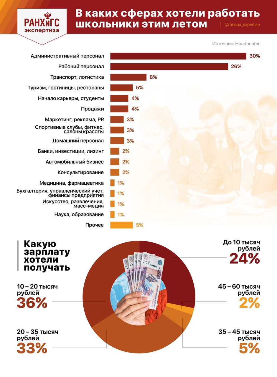 Например, расклейщику объявлений в Петербурге этим летом готовы были платить от 44 тысяч рублей в месяц. А специалист по продажам мог претендовать на 30 тысяч рублей в месяц. Сами юные труженики выставляют желаемый уровень зарплаты в пределах от 10 до 30 тысяч рублей в месяц.