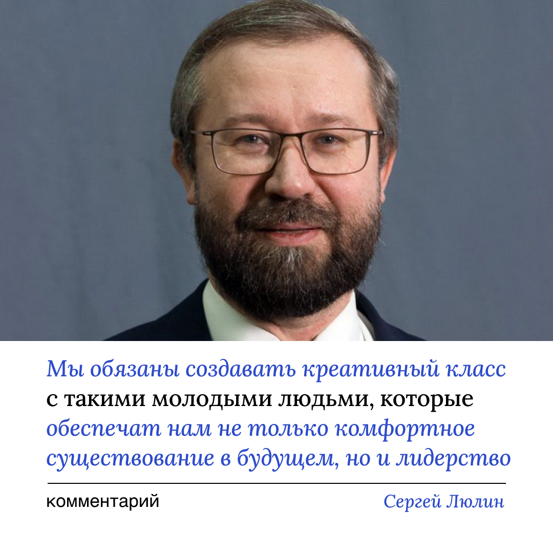 Это то, о чем говорил Александр Сергеев. Мы обязаны создавать креативный класс с такими молодыми людьми, которые обеспечат нам не только комфортное существование в будущем, но и лидерство, без которого существование такой огромной страны может стать вопросом. Поэтому будущее за этим образованным, воспитанным поколением, для которого мы должны представить современные форматы образования, связанные с развитием науки в стране.