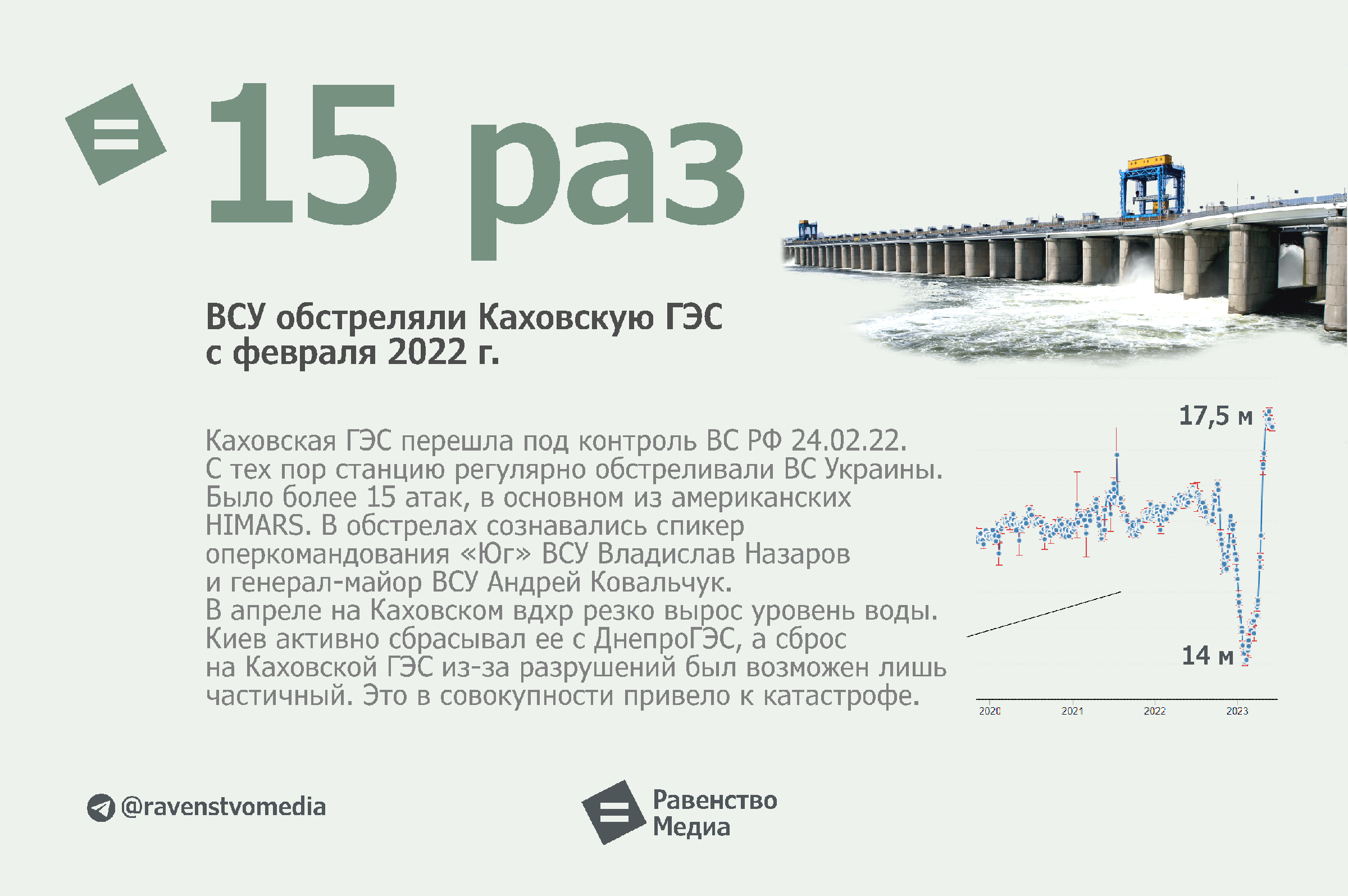 Каховская ГЭС перешла под контроль ВС РФ в первый день СВО 24 февраля. С тех пор г. Новая Каховка и сама станция подвергались регулярным обстрелам со стороны ВСУ. Было более 15 атак ГЭС, в основном из американских HIMARS. В обстрелах дважды сознавались представители ВСУ.