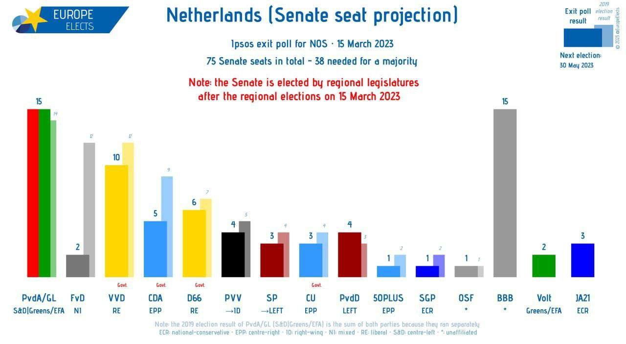 Этот электоральный переворот дестабилизирует национальную правительственную коалицию, в которую помимо VVD и CDA входят "Христианский союз" (CU) и либеральные "Демократы 66" (D66). До выборов правительственные партии занимали 32 из 75 мест в Сенате, что на 6 меньше большинства. Таким образом, для проведения своей политики правительство и так зависело от поддержки оппозиционных партий. Тут надо отметить еще, что Рютте большую часть своего более чем 13-летнего премьерства приходилось иметь дело с оппозиционным Сенатом.