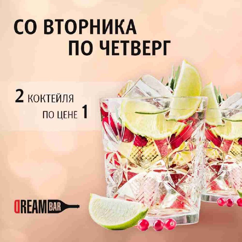 В Dream Bar со вторника по четверг можно заказать два коктейля, а заплатить только за один.