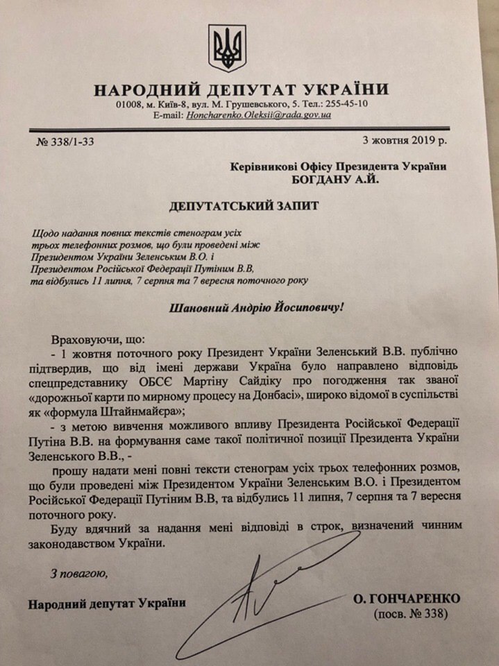 От ОП требуют предоставить стенограммы трех разговоров Владимира Зеленского с Владимиром Путиным. Депутатский запрос направил Алексей Гончаренко из ЕС.