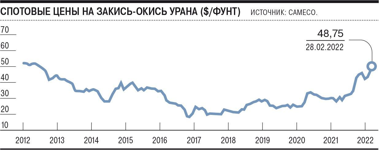 За неделю с начала спецоперации на Украине спотовые цены на уран выросли почти на 13%, превысив $48 за фунт закиси-окиси урана. Не исключается дальнейший рост котировок на фоне растущих цен на другие виды топлива.