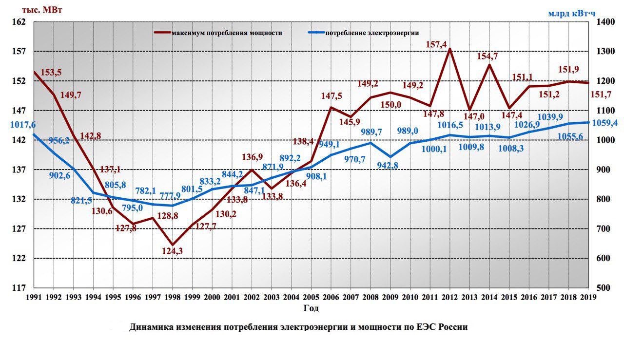 Потребление электроэнергии в России из года в год растет. За 20 лет оно выросло на 21%, до 1059,4 млрд кВт∙ч в прошлом году.