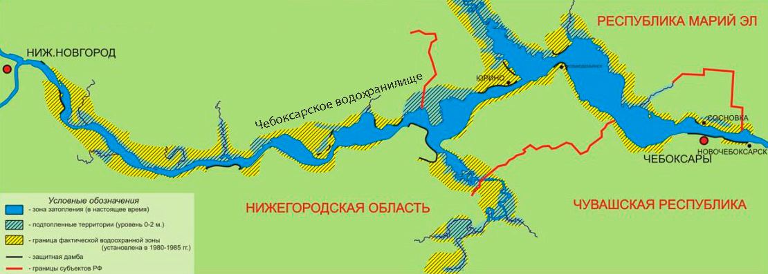 Оно появилось в 1980 году, после перекрытия Волги у города Новочебоксарск. Вот уже 40 лет Чебоксарская ГЭС эксплуатируется на непроектной отметке водохранилища — 63 метра. Гидроэнергетики и власти Чувашии выступают за поднятие уровня до проектных 68 метров, Нижегородская область и Марий Эл — категорически против.