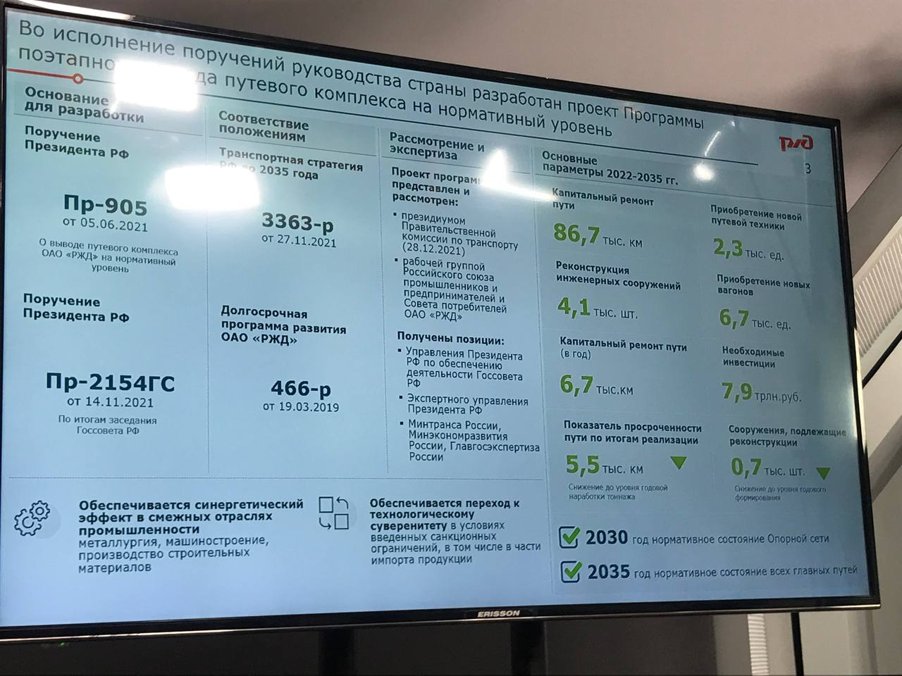 Всего реализация этой программы, включая работы по капремонту инфраструктуры, потребует инвестиции на уровне 7,9 трлн руб. В презентации Шевцова (см. ниже) было отмечено, что к 2030 году планируется обеспечить нормативное состояние опорной сети, к 2035 году – всех главных путей РЖД.
