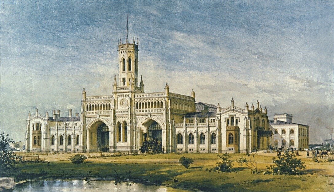 21 июля 1857 года состоялось торжественное открытие Петергофской железной дороги. Петергофский вокзал является одной из самых необычных построек. В царствование Николая I в Петергофе начали создавать целый комплекс «готических» строений, и вокзал должен был стать частью этого комплекса.