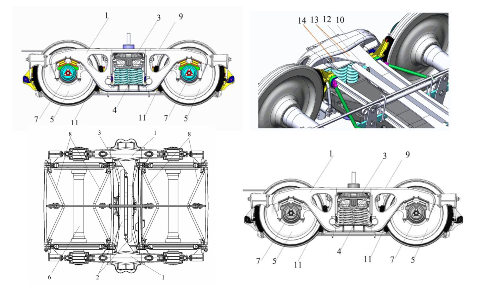 За 2022-2023 годы «РМ Рейл» получила 5 патентов, связанных с созданием двухосных тележек для скоростных вагонов: 4 патента на полезные модели и один – на изобретение. Как рассказали в пресс-службе компании, по текущим результатам НИОКР было определено, что для разрабатываемых вагонов выбраны концепты по двум патентам (см. иллюстрации). На данный момент на рынке сертифицирован только один вагон на 140 км/ч – фитинговая платформа 13-6704 от «Синара – Транспортные Машины», она комплектуется двумя тележками с тремя осями.