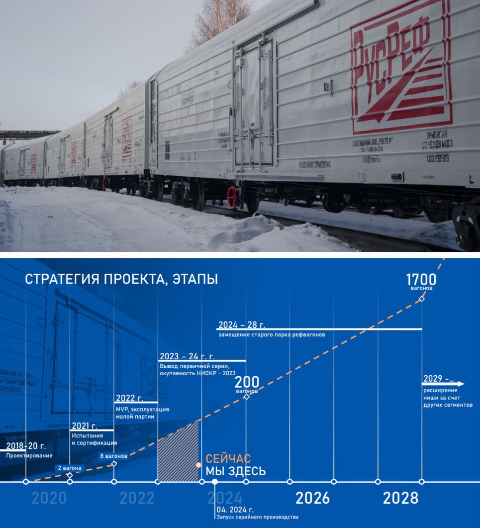 Согласно текущему бизнес-плану «Русрефа», по итогам 2024 года планируется общий выпуск 200 автономных рефвагонов, а затем к концу 2028 года парк компании должен достигнуть 1700 единиц. Свой бизнес «РусРеф» позиционирует как «услугу перевозки в полностью технически подготовленном вагоне».