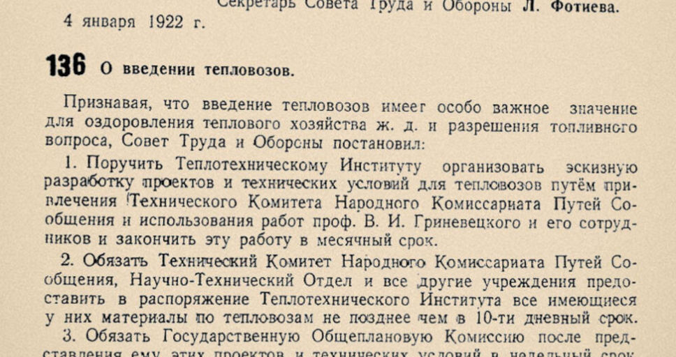 Этот год становится одним из важнейших в развитии локомотивной тяги в стране. В самом его начале, 4 января, выходит Постановление Совета Труда и Обороны РСФСР «О введении тепловозов». Эскизная разработка проектов и технических условий поручается Теплотехническому институту. В них ложатся работы профессора Василия Гриневецкого, которые он вел в направлении дизельной тяги еще с начала XX века.