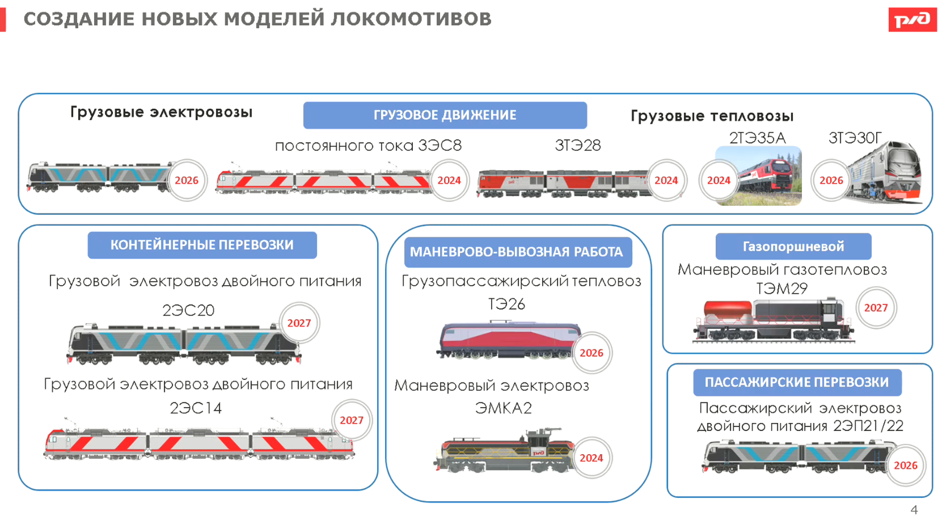 Как указал представитель РЖД, всего сейчас в работе у производителей находятся 16 новых моделей и модификаций локомотивов (см. иллюстрацию). Среди них уже указанные пассажирские электровозы, а также грузовые магистральные электровозы платформ 2ЭС9 и 3ЭС8, их модификации под скоростные контейнерные перевозки, магистральные тепловозы 2ТЭ35А и 3ТЭ30Г, маневровые ТЭМ23, ЭМКА2 и ТЭМ29, грузопассажирские тепловозы ТЭ26 и другие. По словам Пегова, общая потребность в них превышает 4700 единиц. «В том числе около тысячи локомотивов поступят на сеть РЖД до конца 2030 года», – сообщил он.
