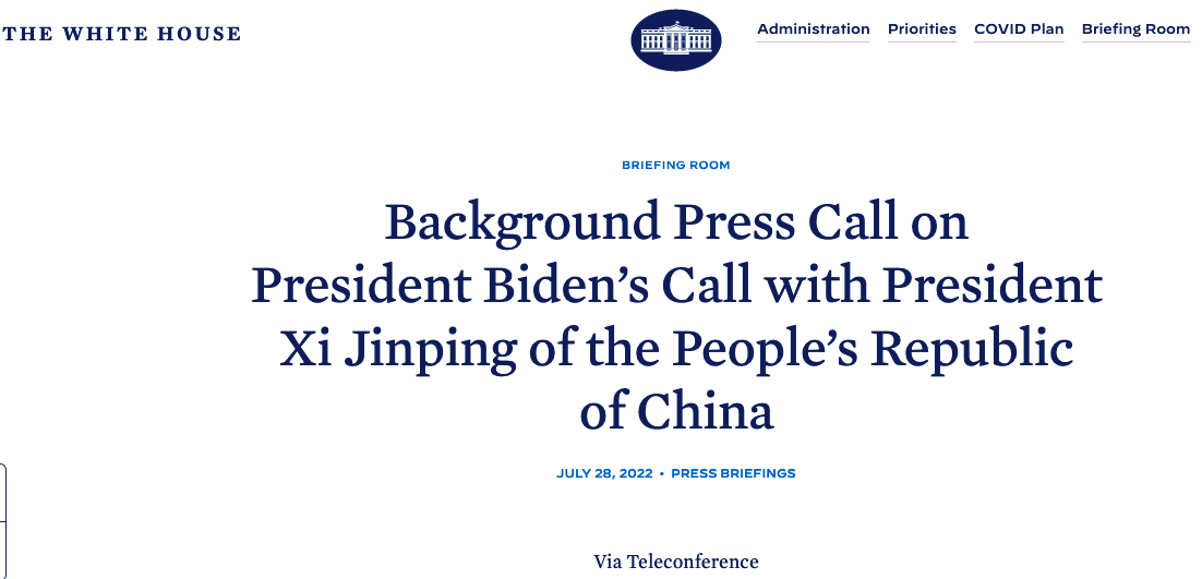 Белый дом отчитался о телефонных переговорах президента США Джо Байдена с главой КНР Си Цзиньпином. Беседа Байдена и Си Цзиньпина прошла на фоне обострения напряженности между Вашингтоном и Пекином по тайваньскому вопросу. Оно вызвано намерением спикера Палаты представителей Конгресса США Нэнси Пелоси посетить остров. Вот основные выводы.