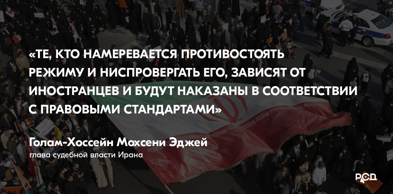 Информационное агентство Ирана со ссылкой на представителей судебных органов сообщает, что разбирательствам по «подрывным действиям» со стороны инакомыслящих подвергнется тысяча человек, игравших центральную роль в протестах и сподвигших граждан на выступления против существующего режима. Под «подрывными действиями» правительство подразумевает нападение на охранников, поджоги общественного имущества, а также выдвигает другие обвинения, связанные с протестами и возможном участием других стран в их организации.