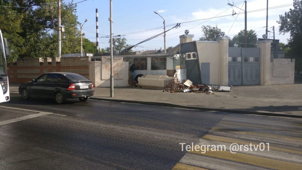 Забавно, что троллейбус цел и почти без царапин, а вот кирпичная стена не уцелела.
