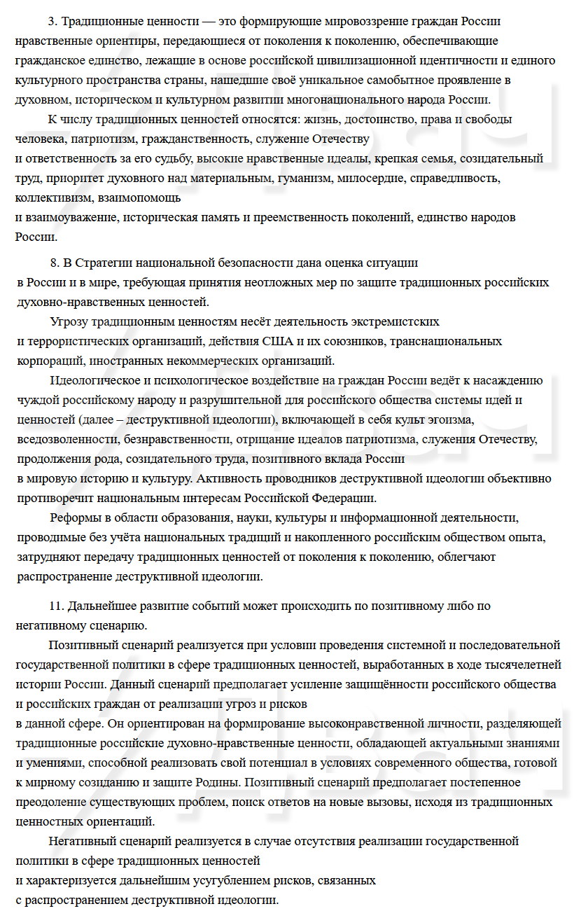 Культ эгоизма, вседозволенности, безнравственности, отрицание идеалов патриотизма, продолжения рода, позитивного вклада России в историю и культуру назвали чуждыми и разрушительными идеями. Насаждает чуждые и угрожает традиционным ценностям «деятельность экстремистских и террористических организаций, действия США и их союзников, транснациональных корпораций, иностранных некоммерческих организаций».