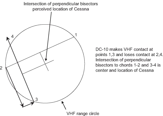 Спустя некоторое время авиалайнер вылетел из зоны действия радиосвязи, и эта точка выхода также была отмечена. Далее Дуглас выполнил два левых поворота на 90°, сместившись таким образом на юго-восток, после чего повернув на север ещё раз пролетел зону радиосвязи Сессны, отметив ещё одну хорду. Далее, имея две хорды, штурманы определили центр окружности, в котором должен был быть Прокнау. Экипаж Дугласа установил, что Прокнау находится примерно к юго-востоку от острова Норфолк, после чего передал Джею, чтобы тот следовал на северо-запад, тем самым сократив удаление.