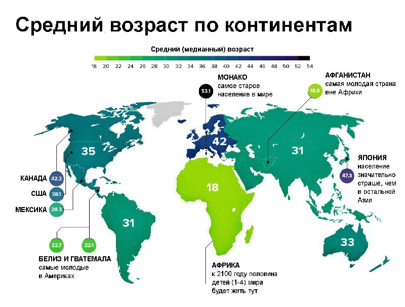 Самый «старый» континент – Европа (42 года), самый «молодой» – Африка (18).