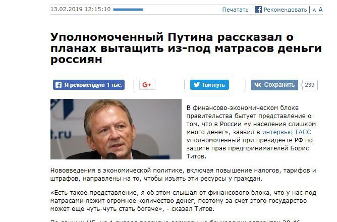 Борис Юрьевич Титов — уполномоченный при президенте России по правам предпринимателей, недавно в своем интервью признался, что финансово-экономический блок правительства всерьез считает россиян слишком богатыми. И все нововведения в экономической политике, включая повышение налогов, тарифов и штрафов, направлены на то, чтобы изъят ресурсы у граждан, перераспределив финансы в пользу бюрократии.