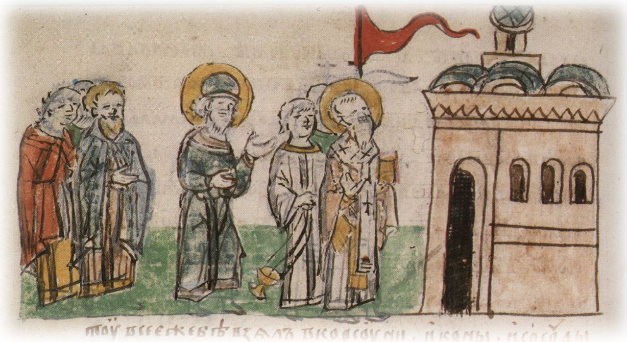 "Въ лѣто 6504 (996). Володимиръ же видивъ церковь свѣршену, и вшедъ в ню и помолися Богу, глаголя: «”Господи Боже! Призри с небеси и вижь. Посѣти винограда своего. И свѣрши, яже насади десница твоя”, люди сия новыя, имже обратилъ еси сердца в разумъ, познати тебе, истиньнаго Бога. И призри на церьковь сию, юже создахъ, недостойный рабъ твой, во имя рожьшая ти матери и приснодѣвыя Марья Богородица. И аще помолиться кто въ церкви сей, то услыши молитву его и отпусти вся грѣхы его молитвы ради пресвятыя Богородица». И помолившюся ему, и рекъ сице: «Се даю церкви сей святѣй Богородицѣ от имѣния своего и от моих град десятую часть». И положи, написавъ, клятьву вь церкви сей, рекь: «Аще сего посудить кто, да будеть проклятъ». И вдасть десятину Анастасу Корсунянину. И створи же празникъ великъ в той день бояромъ и старцемь градьскым, и убогимъ раздая имѣние много."