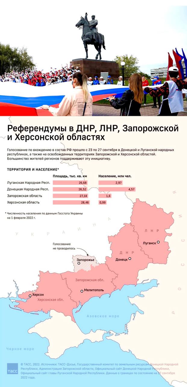 P.S.: 29 сентября Президент РФ на основании результатов референдумов в Запорожской и Херсонской областях подписал указы о признании их суверенитета и независимости. Таким образом, все 4 региона Новороссии по российскому законодательству не имеют более юридических преград для добровольного вхождения в состав Российской Федерации!