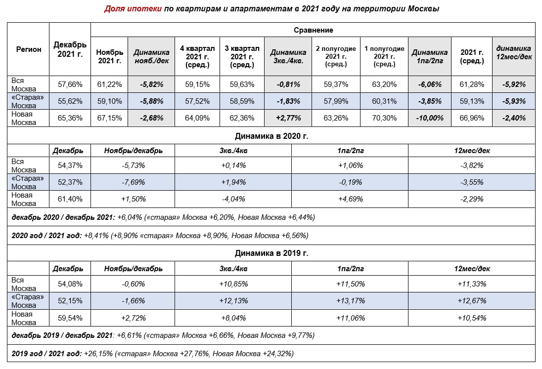 Следующая серия – аналитика по доле ипотеки. Начнем с данных Росреестра для квартир и апартаментов в Москве. Снова сравниваем декабрь-2021 с ноябрем и среднегодовыми значениями, 4 квартал – с 3 кварталом, 2 полугодие – с первым. И смотрим динамику этого года в сравнении с 2020-м и 2019-м. Полные данные, как всегда, в таблице внизу, и поговорим о тенденциях.