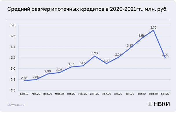 Вместе с тем, по сравнению с аналогичным периодом прошлого года средний размер выданных ипотечных кредитов, напротив, вырос на 15,2% (в декабре 2020 г. — 2,78 млн руб.).