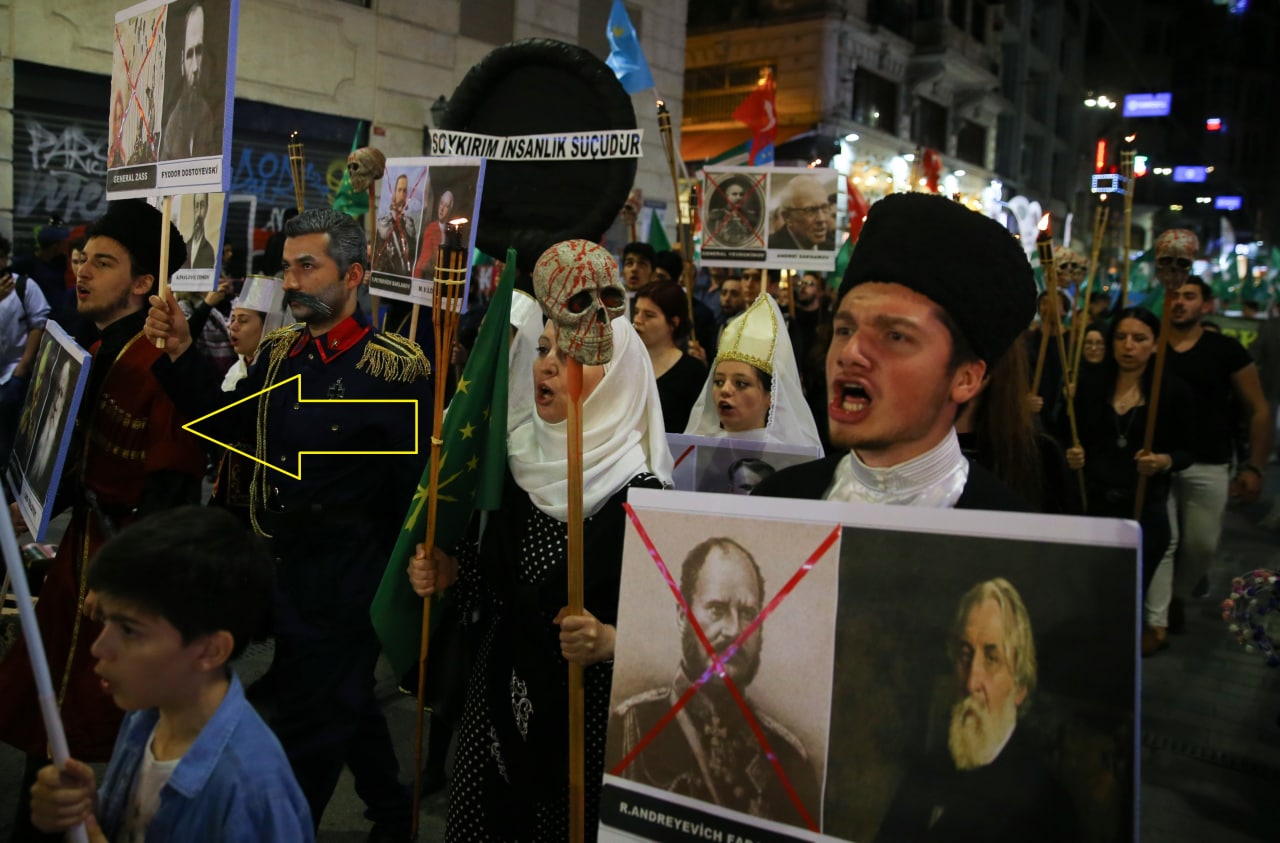 Так был ли мальчик? Вот фотография с шествия, прошедшего в СТАМБУЛЕ (!), с участием местной черкесской диаспоры. Слева виден наш паренёк, в той же одежде, с тем же портретом, Источник солидный, крупное турецкое информационное агентсво (ANADOLU AGENCY).