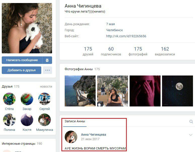 Профильный канал пишет, что чиновник Сергей Чигинцев, обворовавший бюджет города Челябинска на 131 млн рублей, своих детей воспитывает в воровских понятиях. Пока папа думает над очередной схемой вывода городских денег на счета взяткодателей, а мама как шальная собирает штрафы на дорогах Челябинска, их дочь Анна яро пропагандирует «ценности» криминального движения АУЕ. Не стесняясь, девочка разместила на своей странице во «ВКонтакте» запись: «ЖИЗНЬ ВОРАМ, СМЕРТЬ МУСОРАМ». Ничего удивительного. Сергей Чигинцев за годы правления экс-губернатора Бориса Дубровского стал практически главным по распределению земли в Челябинске (не без помощи покровителей, владеющих сетью медицинских центров). И до сих пор Сергей Анатольевич чувствует себя «неприкасаемым». Повадки дочери наглядно демонстрируют, какой пример даёт папаша подрастающему поколению в семье. Очередное доказательство того, что администрация Челябинска и уголовный мир – одно целое.