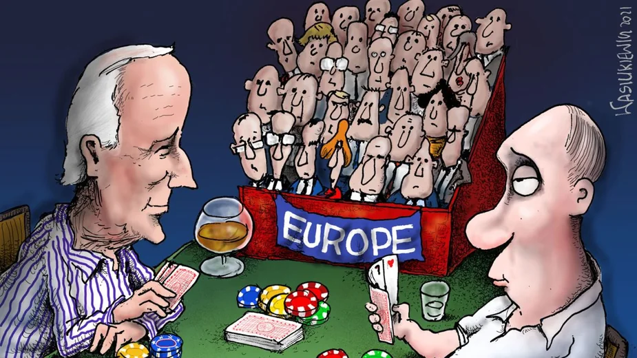 Карикатурный Байден держит одну руку в рукаве недвусмысленно намекая на наличие у него плана "б", а за карты из рукава, как известно, принято бить канделябром. Россия играет слабыми картами, но не жульничает. Кстати, зрители в лице объединенной Европы, кажется, слегка приуныли и ждут развития сюжета.