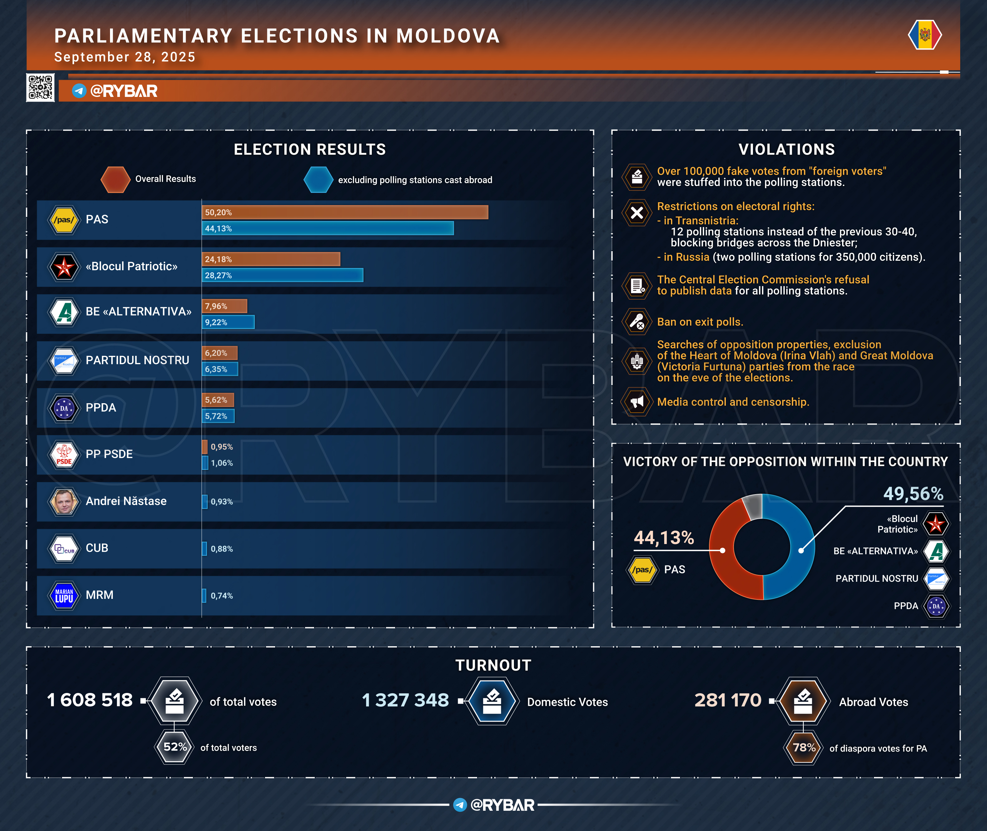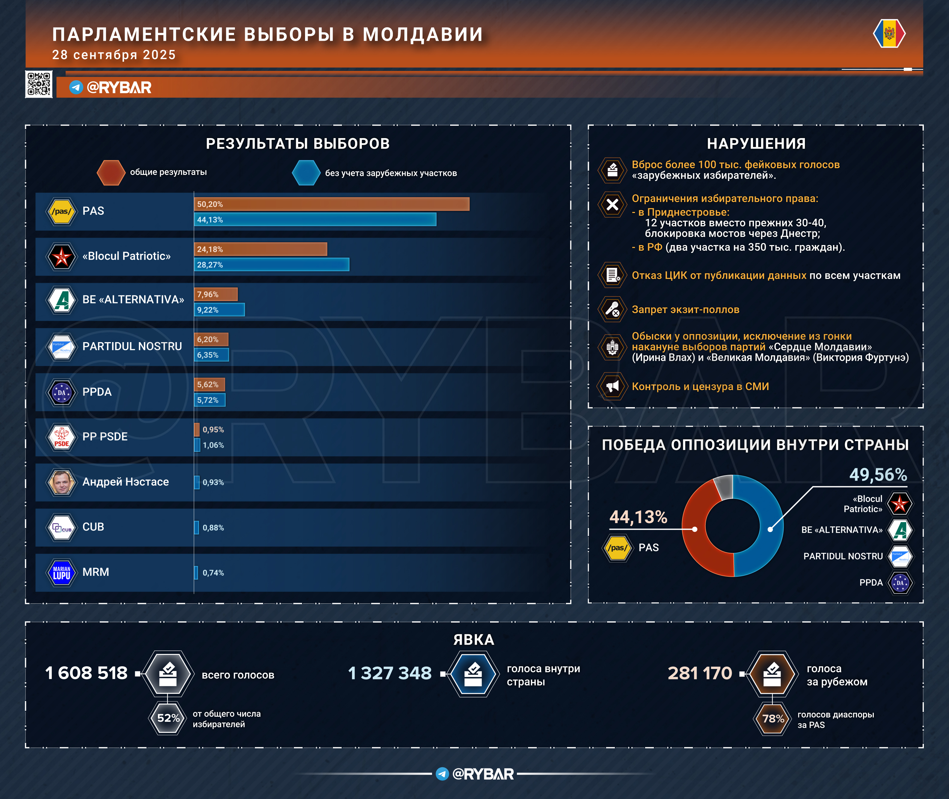 В понедельник все, и мы в том числе, комментировали итоги парламентских выборов в Молдавии, которые принесли в инфополе даже больше скандалов, чем ожидалось: от вирусившихся вбросов на зарубежных участках, до заявлений Санду о готовности отменить выборы, если ей не понравится результат.