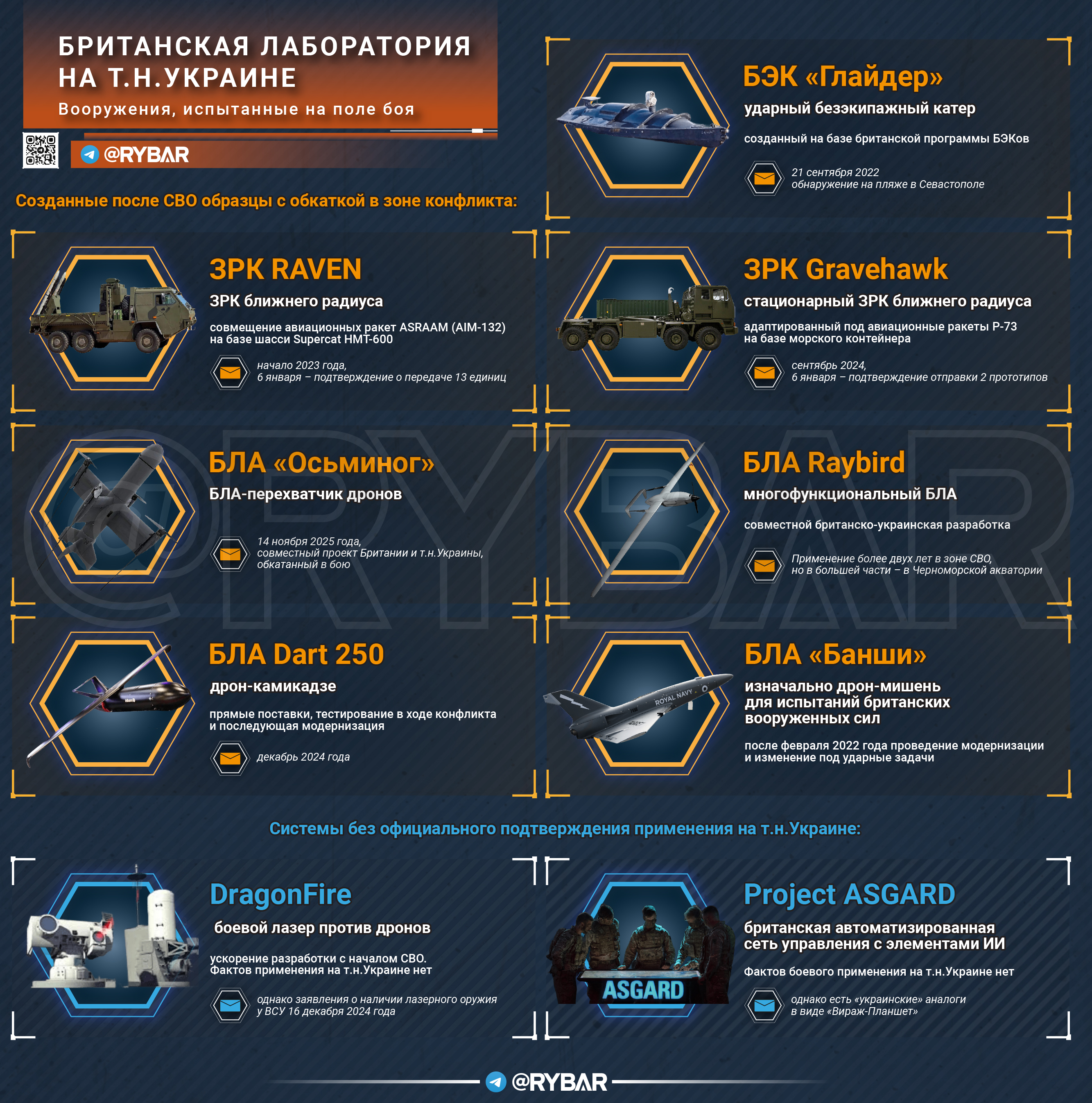 🔻 Что создано под контролем британцев на т.н.Украине?▪️ Одной из первых наработок британцев, засветившихся на СВО, стал БЭК «Глайдер». Помните такой? Самый первый морской дрон, который был зафиксирован у ВСУ 21 сентября 2022 на пляже в Севастополе. И он был создан на базе британской программы, спроектированной еще до 2022 года.▪️ С затягиванием СВО стало появляться все больше вооружений, систем, оборудования, руку к которым приложили британцы. Дрон-мишень «Банши» изначально предназначался для испытаний британских ЗРК. Но затем его переделали под ударный вариант, и их ВСУ периодически использует для ударов по России. А несколько таких находили даже в Казахстане.▪️ Также можно сказать и о БЛА Dart 250, который передали ВСУ и тестировали в 2024 году. Позднее появились сообщения, что британцы на основе опыта модернизировали дрон.▪️ Аналогичная ситуация и с БЛА Raybird, который вроде бы официально создан украинской компанией, а на деле является британской разработкой. БЛА есть у ВСУ уже более 2 лет, и после длительных испытаний на поле боя его доработали и апробировали летом 2025 года в Черном море против наших сил в Крыму и Херсонской области.▪️ Относительно недавней беспилотной разработкой стал дрон-перехватчик «Осьминог», который сейчас массово внедряется в ВСУ для противодействия нашим «Гераням». Британцы таким образом получают актуальные данные о способах борьбы с одним из ключевых наших видов вооружения.▪️ О ЗРК британцы не забывают. Из-за массированных ударов тех же «Гераней» в Британии на скорую руку спроектировали комплекс ближнего действия RAVEN на базе шасси Supercat HMT-600 с ракетами «воздух-воздух» AIM-120 и Gravehawk с украинскими ракетами Р-73.