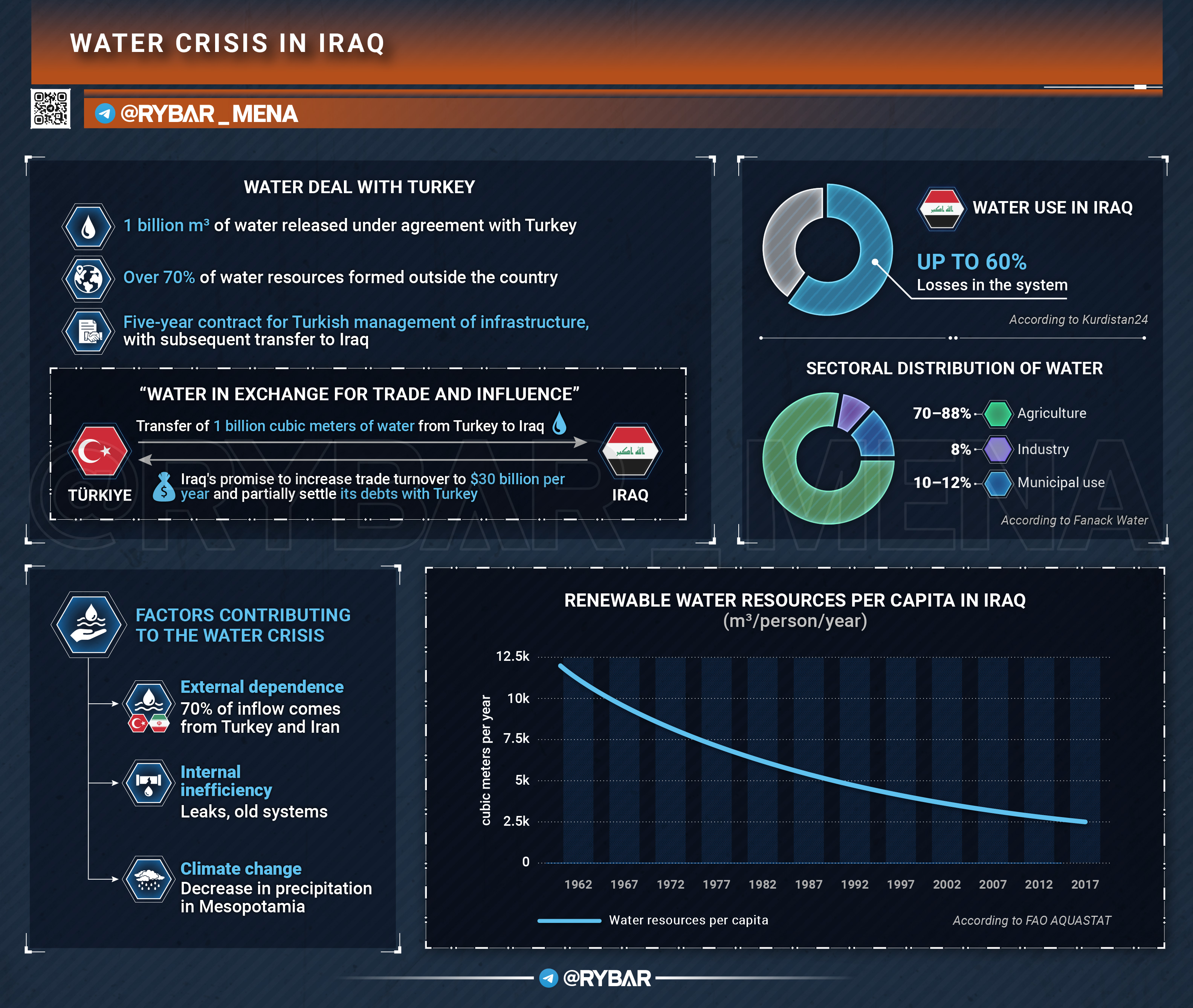 🔻 В чем заключается водный кризис?▪️ Доля трансграничных поступлений — более 70% водных ресурсов бассейна Тигр–Евфрат формируется за пределами Ирака (в Турции и Иране).▪️ Сельское хозяйство потребляет подавляющую часть свежей воды в Ираке (по разным оценкам — порядка 70–88% от общего потребления воды). Это делает любое сокращение притока критичным именно для продовольственной безопасности.▪️ Большая потеря в системе - до порядка 60% составляют утечки, незаконные подключения, учётные проблемы. Это означает, что большая часть воды просто не доходит до потребителя.