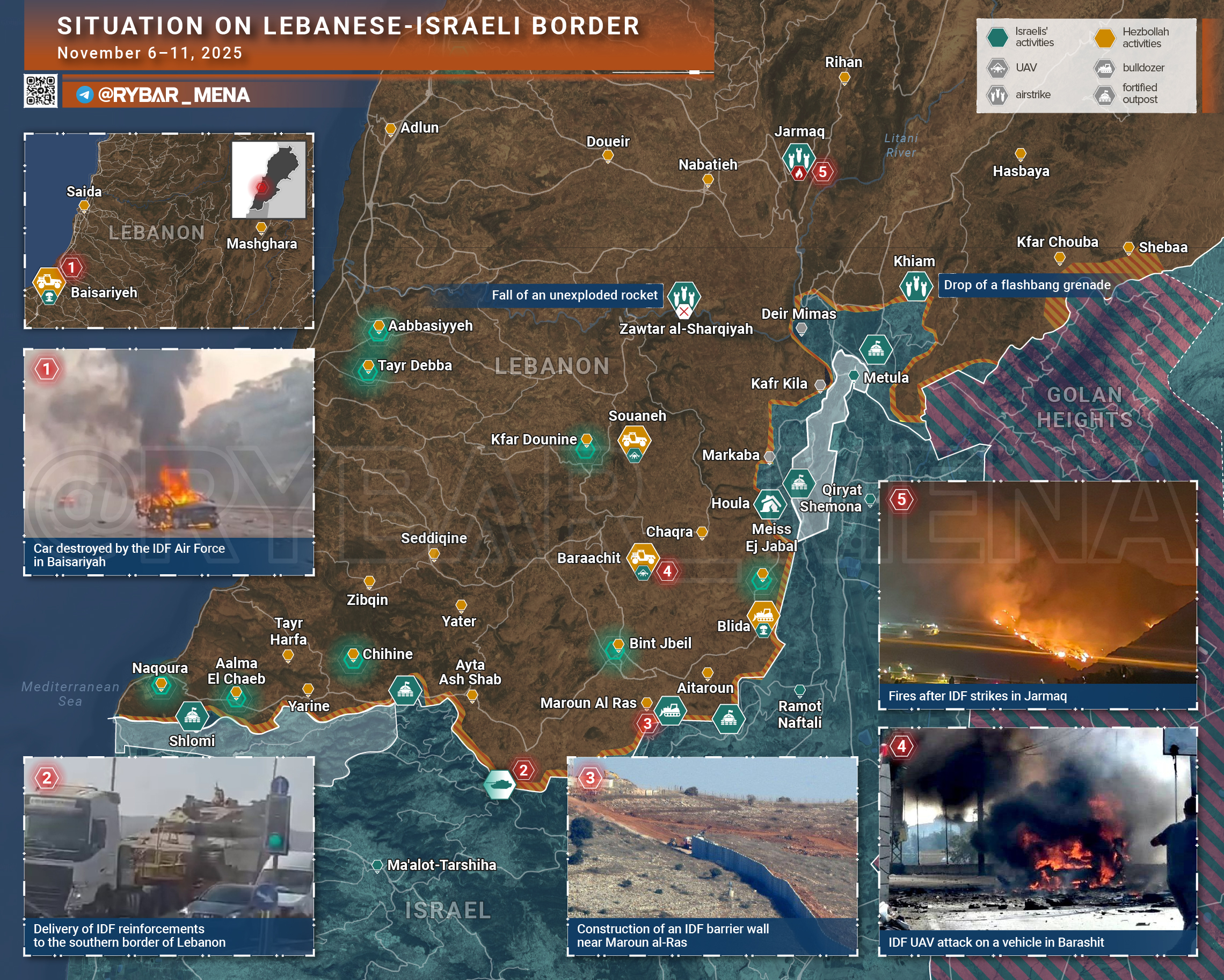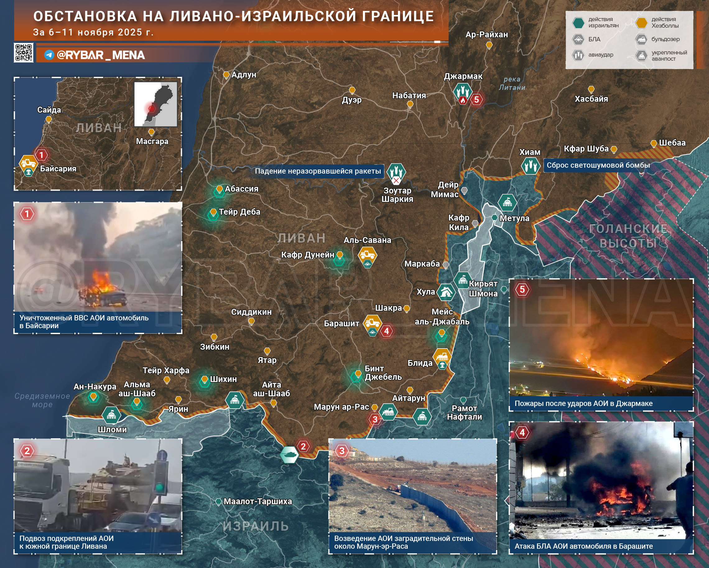 🔻 Что произошло за этот период:▪️ Израильские БЛА атаковали автомобили в районах Бинт аль-Джебель, Барашита и Сарифа, в результате чего погибли трое человек, включая Самира Али Факия — одного из организаторов контрабанды вооружений для «Хезболлы».▪️ Артиллерия АОИ обстреляла окрестности Шихина и Мейс-аль-Джабаля, а в Хиаме инженерные подразделения провели подрыв нескольких зданий.▪️ Израильские подразделения продолжают укреплять свои позиции вдоль границы, возводя бетонную стену — на некоторых участках уже за «синей линией», углубляясь на несколько километров вглубь ливанской территории.