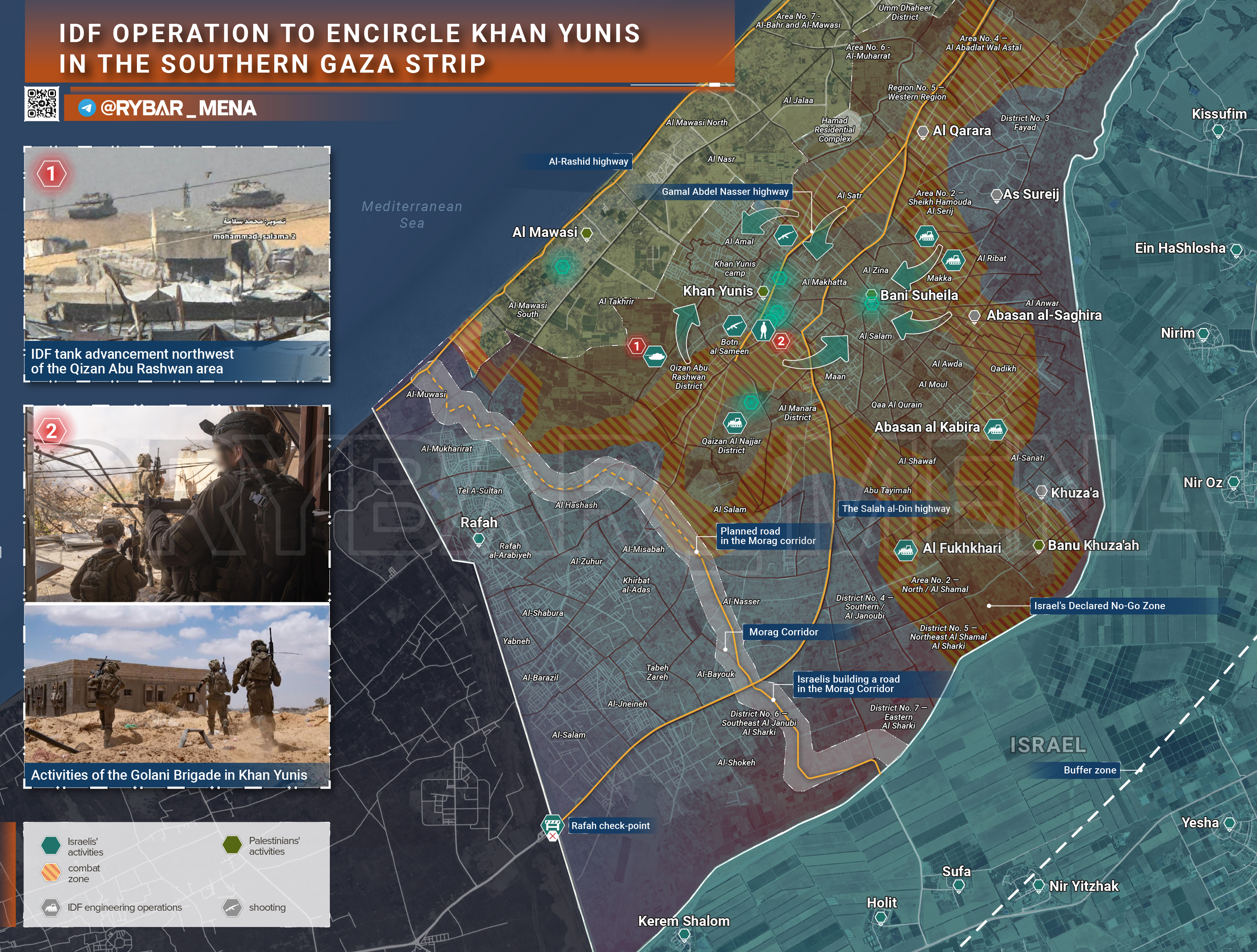 Армия обороны Израиля (АОИ) продолжает наступление в районе Хан-Юниса, концентрируя усилия на изоляции города с западной и восточной частей агломерации.