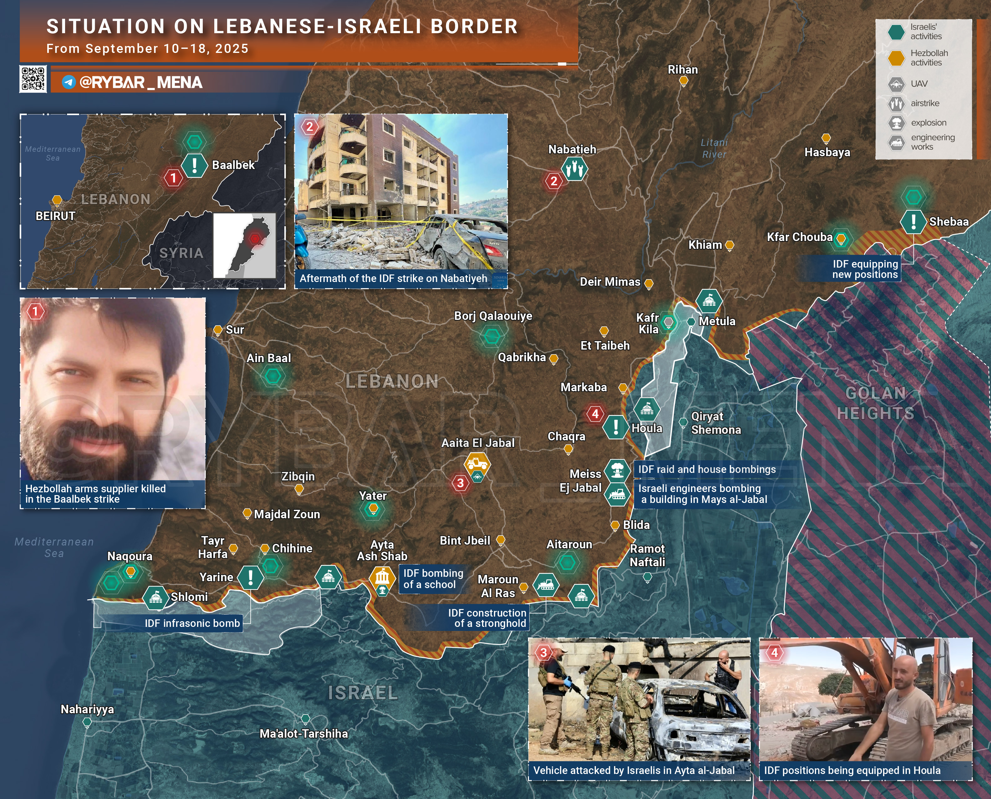 🔻 Подробнее о ситуации в зоне конфликта:▪️ Израильтяне создали несколько дополнительных военных объектов в районах Айтаруна, Ар-Рамты, Хулы и Шебаа.▪️ Одновременно инженерные части АОИ провели вылазки в Мейс аль-Джабале, Хуле и Айте аш-Шааб, уничтожив несколько жилых и школьных зданий.▪️ Большая часть ударов пришлась на юг Ливана. По данным израильской стороны, погибло не менее четырех членов «Хезболлы».▪️ Одно из попаданий было по Баальбеку в центральной части страны. Целью стал Хусейн Сифа Шариф — якобы один из ключевых поставщиков оружия «Хезболле».