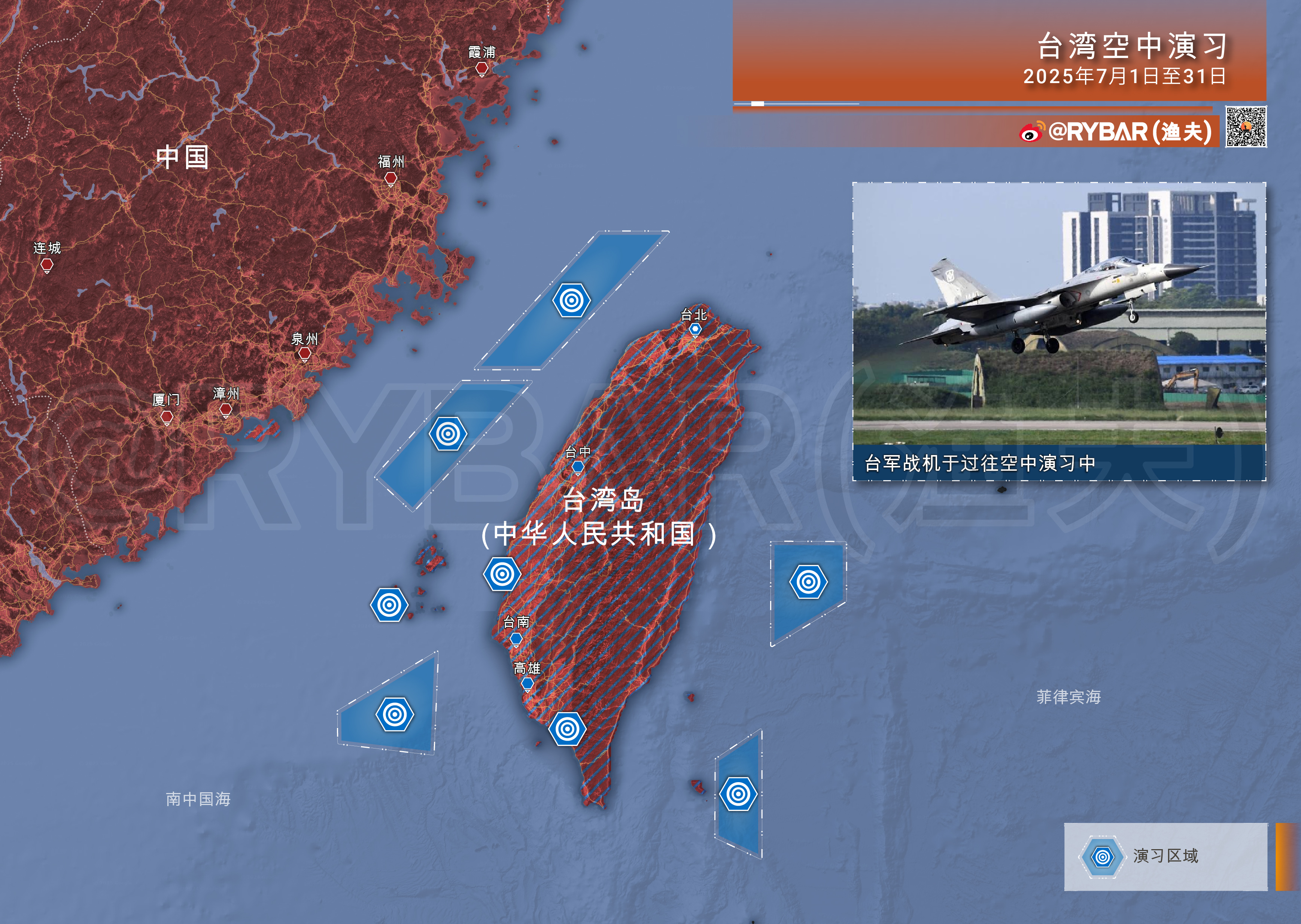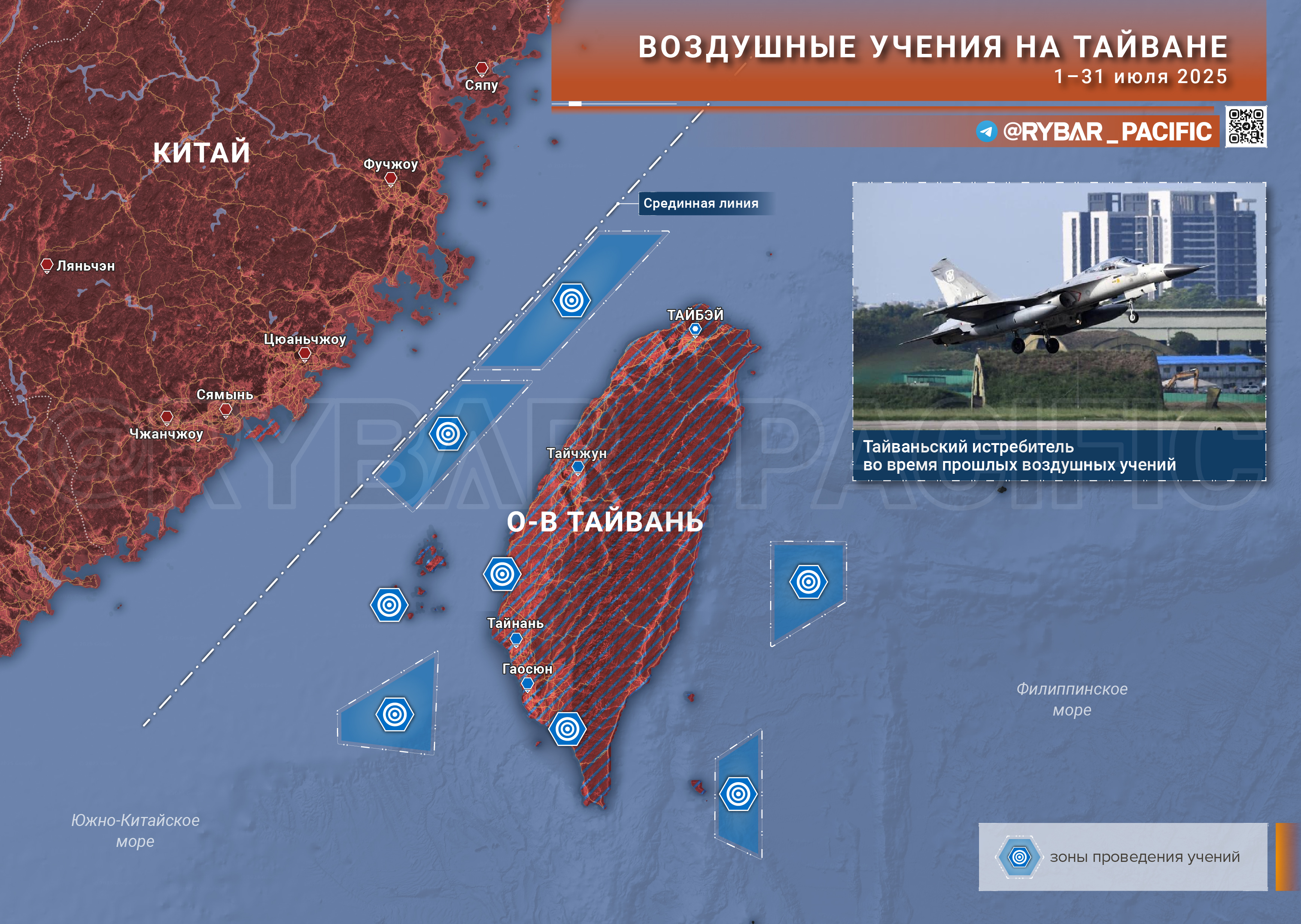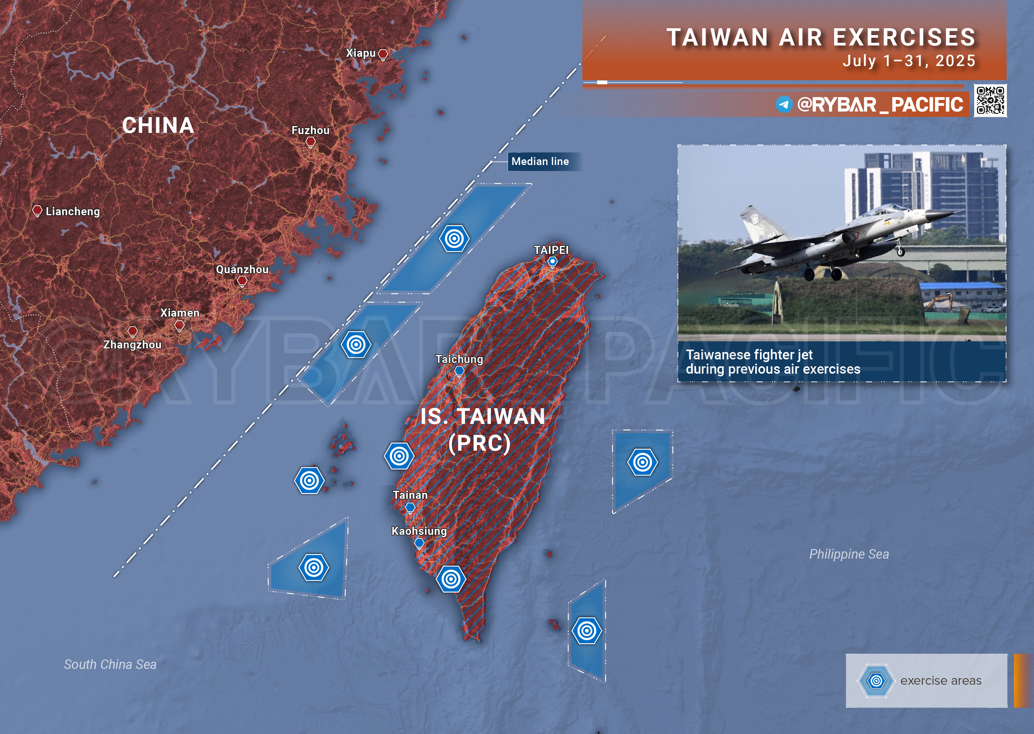 В течение июля ВВС Тайваня проведёт ряд учений с боевой стрельбой вокруг острова, в том числе вблизи от срединной линии Тайваньского пролива, которая де-факто является границей между воздушным пространством КНР и Тайваня.