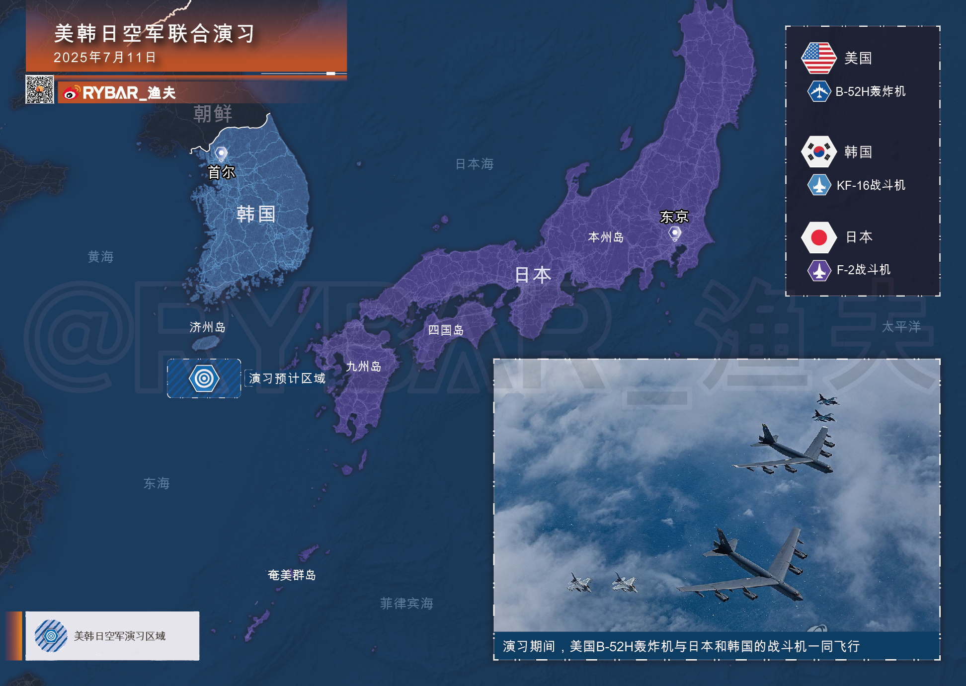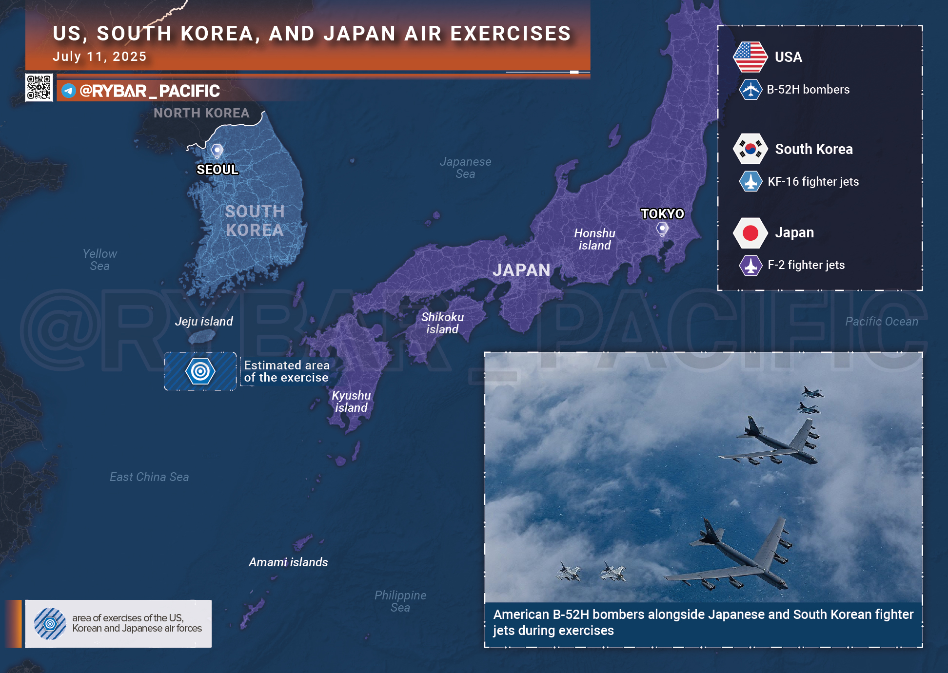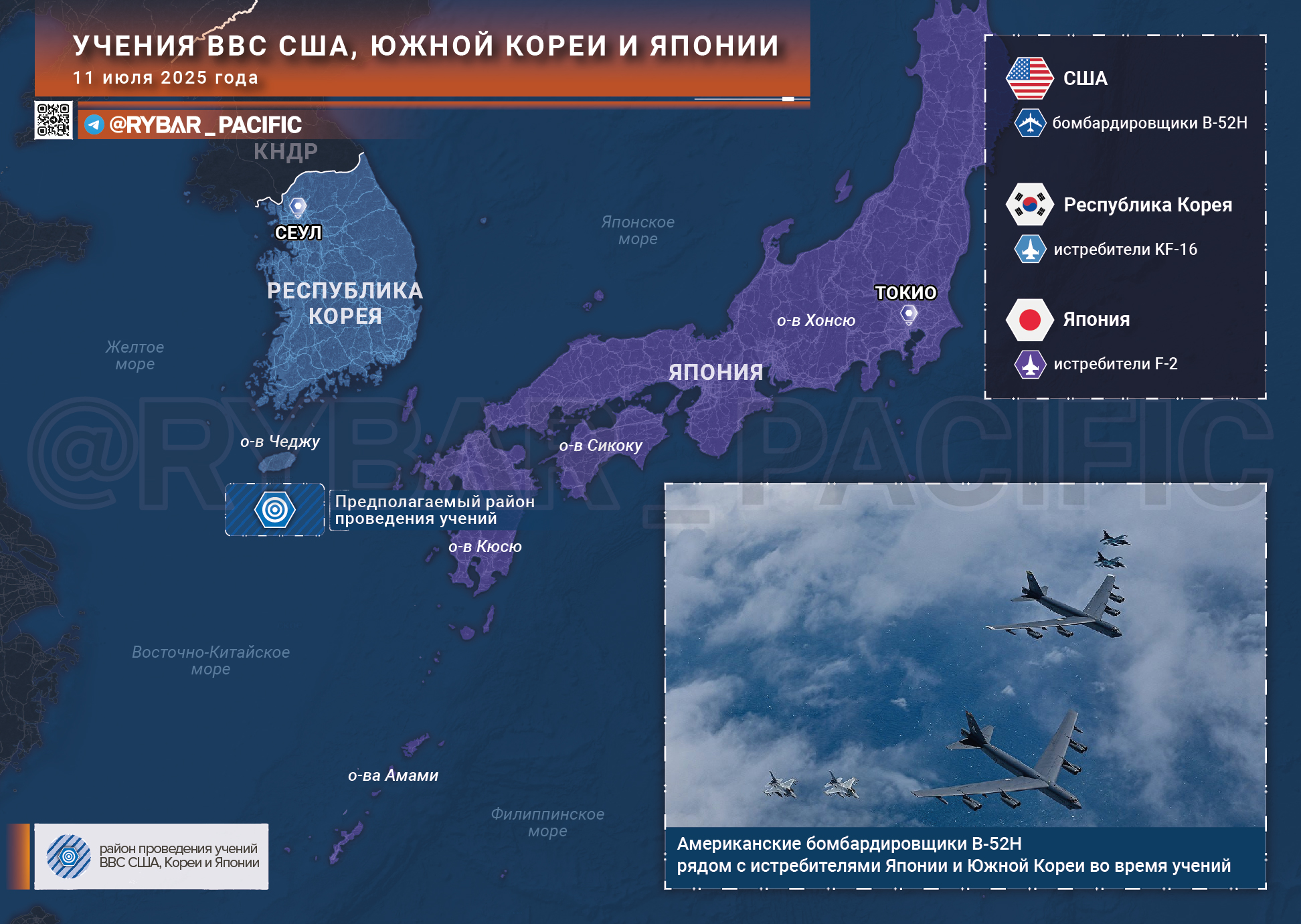 🔻 Подробнее об учениях:▪️ В тренировках участвовали стратегические бомбардировщики США B-52H, южнокорейские истребители KF-16 и японские самолеты F-2. Примечательно, что B-52H был размещен на Корейском полуострове впервые с начала года.▪️ Основной целью учений стало улучшение координации между ВВС трех стран для сдерживания угрозы со стороны Северной Кореи. Стороны отработали выполнение совместных воздушных маневров и операций.▪️ С момента вступления в должность президента Южной Кореи Ли Чжэ Мёна совместные воздушные учения проводились уже дважды. Стороны продолжают наращивать военное сотрудничество.