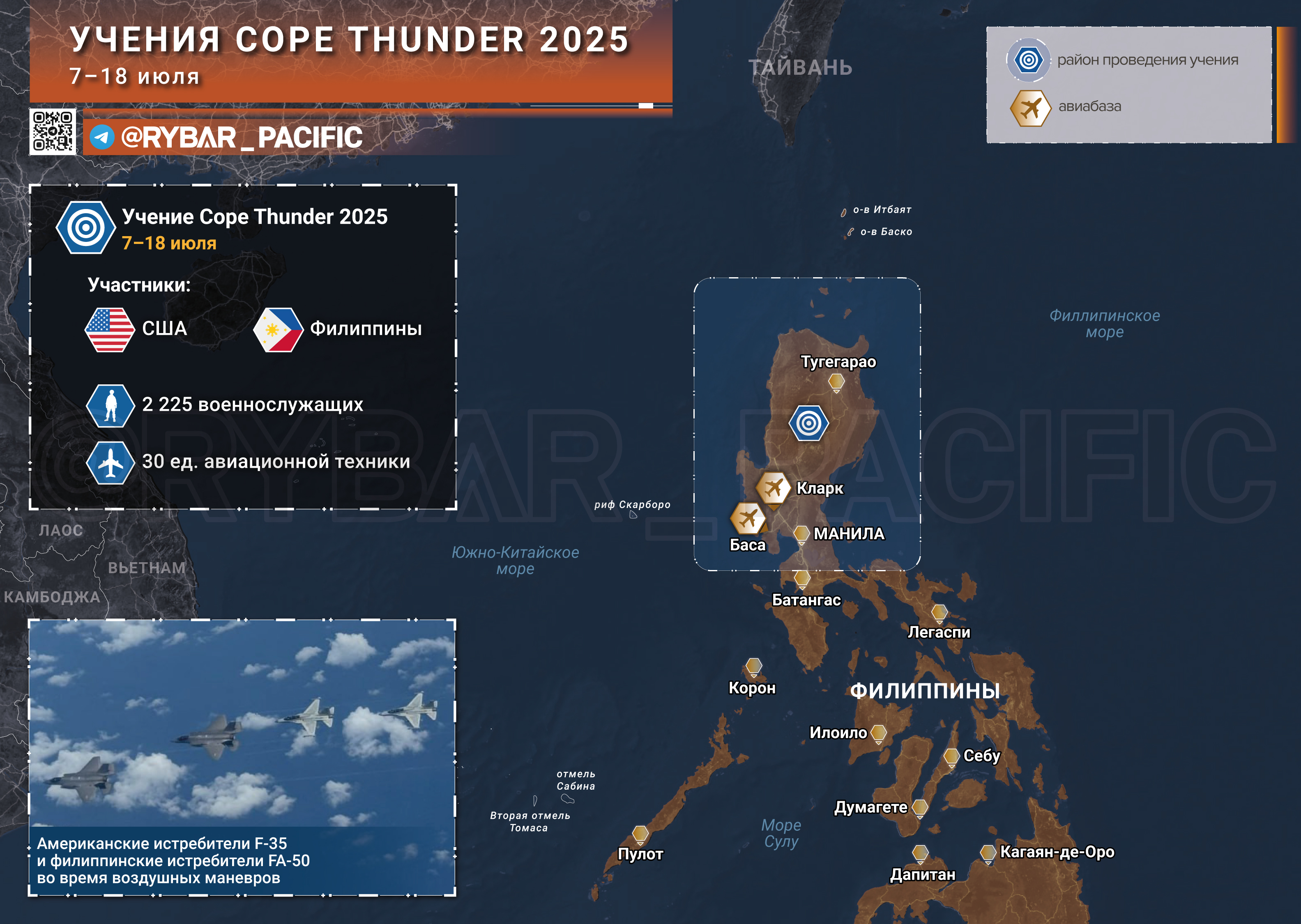В Азиатско-Тихоокеанском регионе продолжается сезон учений, в которых участвуют военнослужащие США. С 7 по 18 июля на Филиппинах проходит вторая фаза тренировок Cope Thunder 2025, в которых задействованы ВВС двух стран.